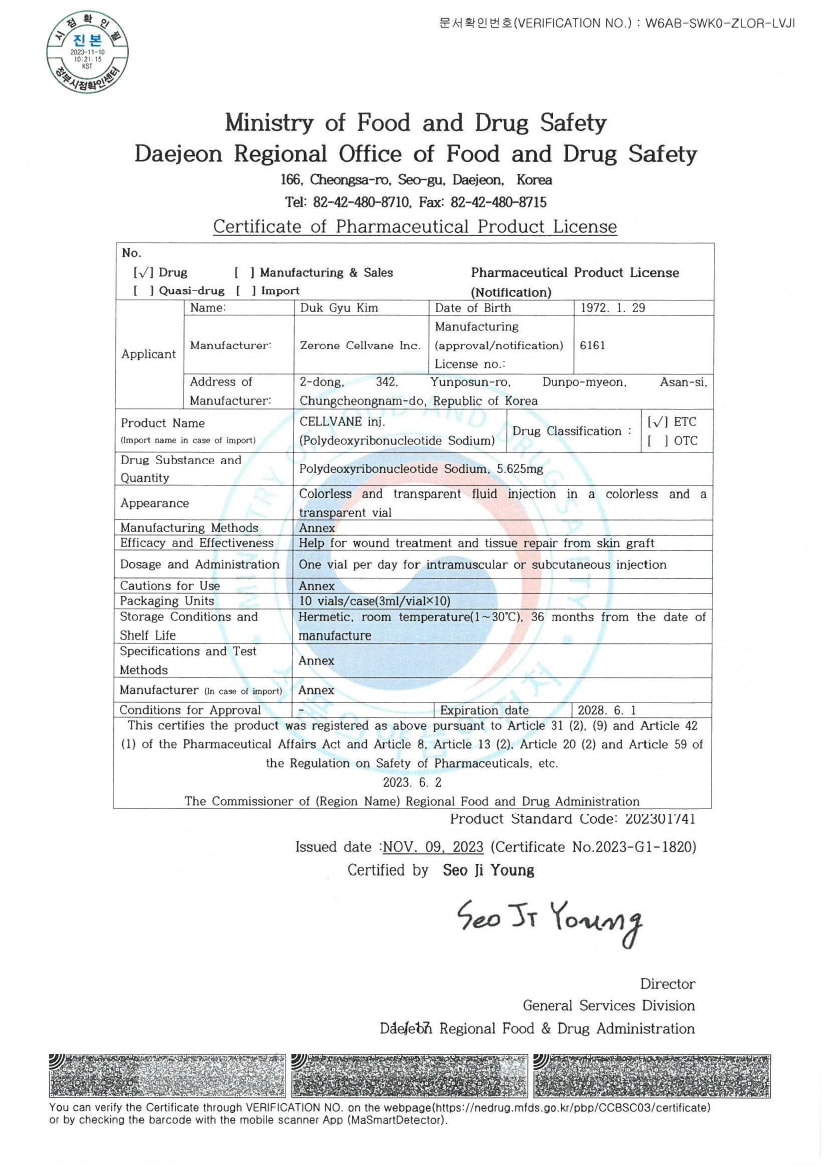 PDRN)は韓国食品医薬品安全処(MFDS)より、専門医薬品として品目許可を取得しています。